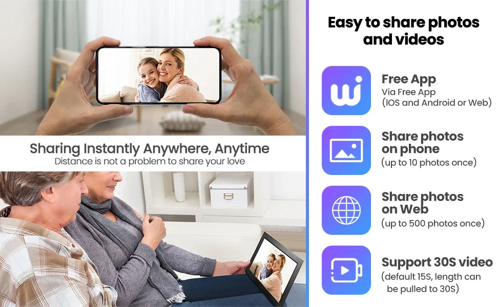 【Instant Wireless Sharing】Connect the electronic frame to home WiFi, and then download the free Uhale App on your phone (download from Android or iOS). You and your family and friends can share photos or videos to the photo frame through free APP, without any subscription fee. Uhale can send 50 pictures and 30 seconds of video in one go!