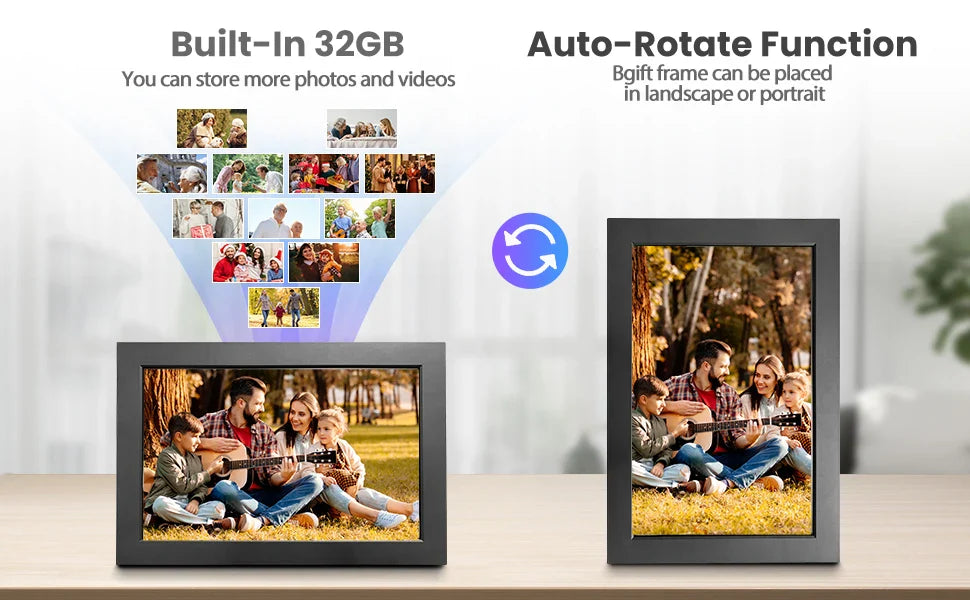 【Splendid picture slideshow】 The digital picture frame on sale auto-rotate has a 10.1-inch touch screen, 1280*800 resolution and 16:10 aspect ratio. IPS technology displays your wonderful memories in full HD.