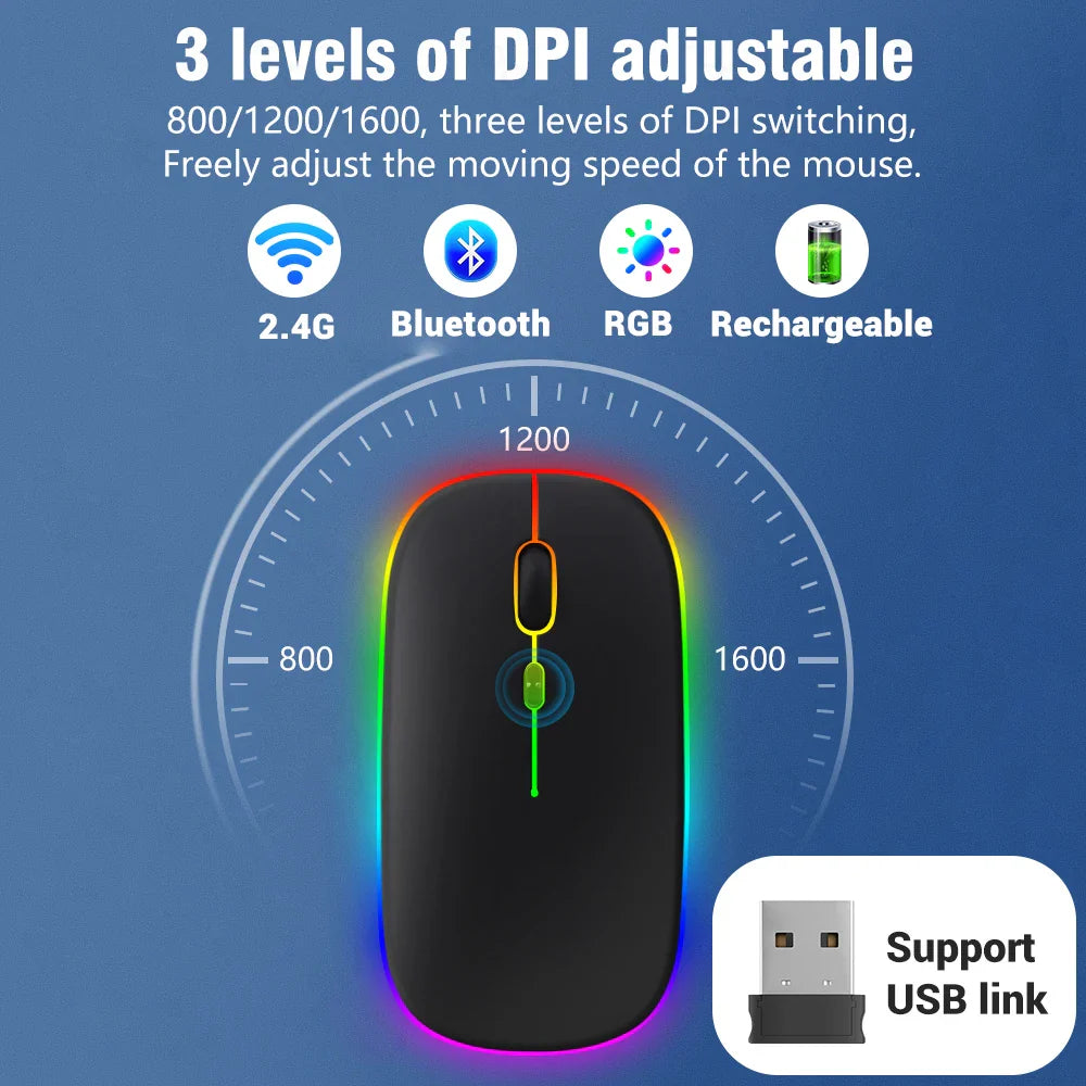 The mouse supports Bluetooth and 2.4GHz USB connection, the keyboard only supports Bluetooth connection.