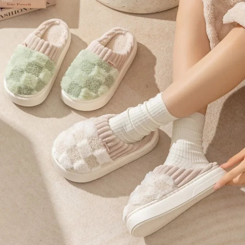 Fashion Couple Winter Slides Warm Plaid Fluffy Slippers Soft Sole Flip Flops For Women And Men Home Indoor Non-slip Cotton Shoes