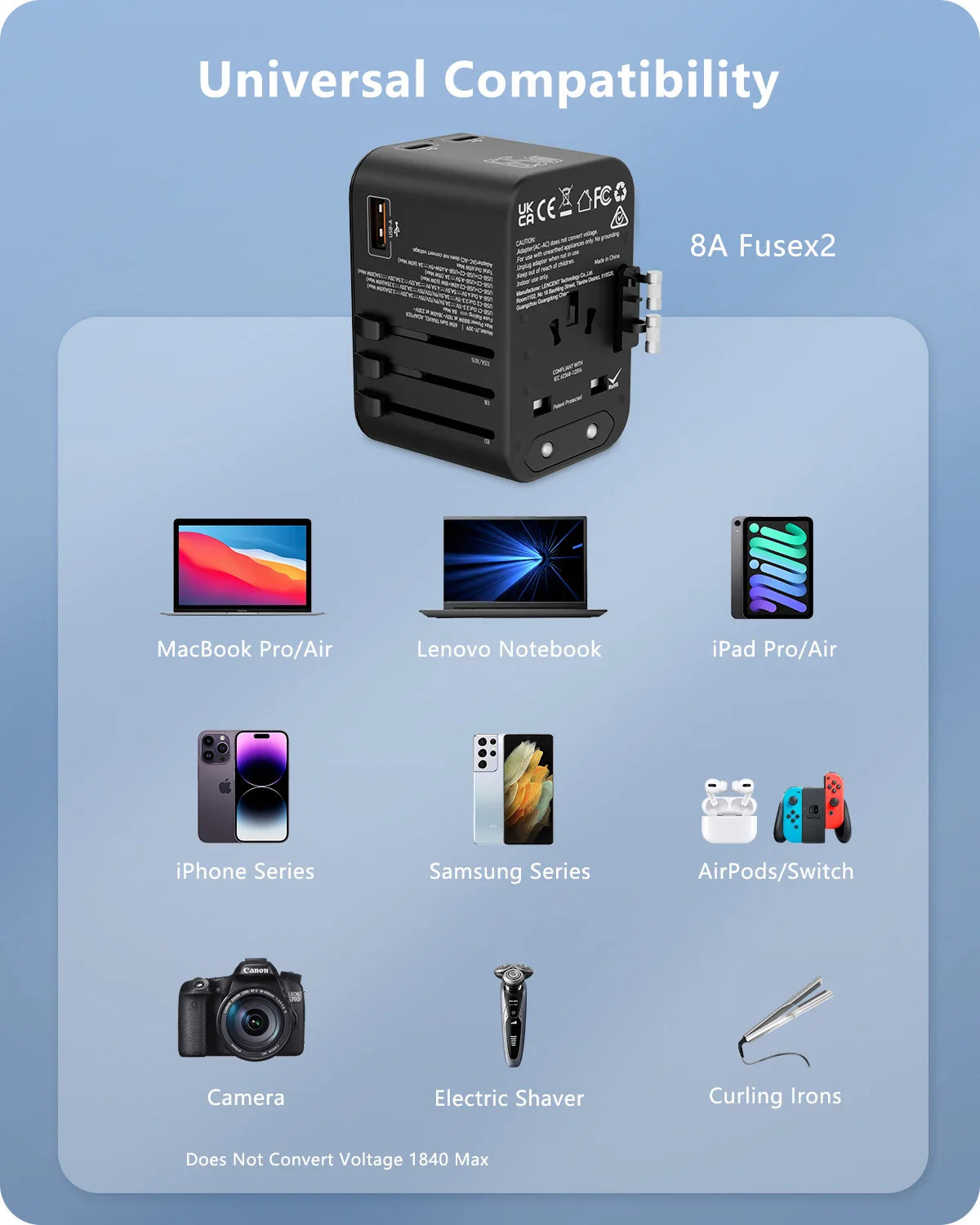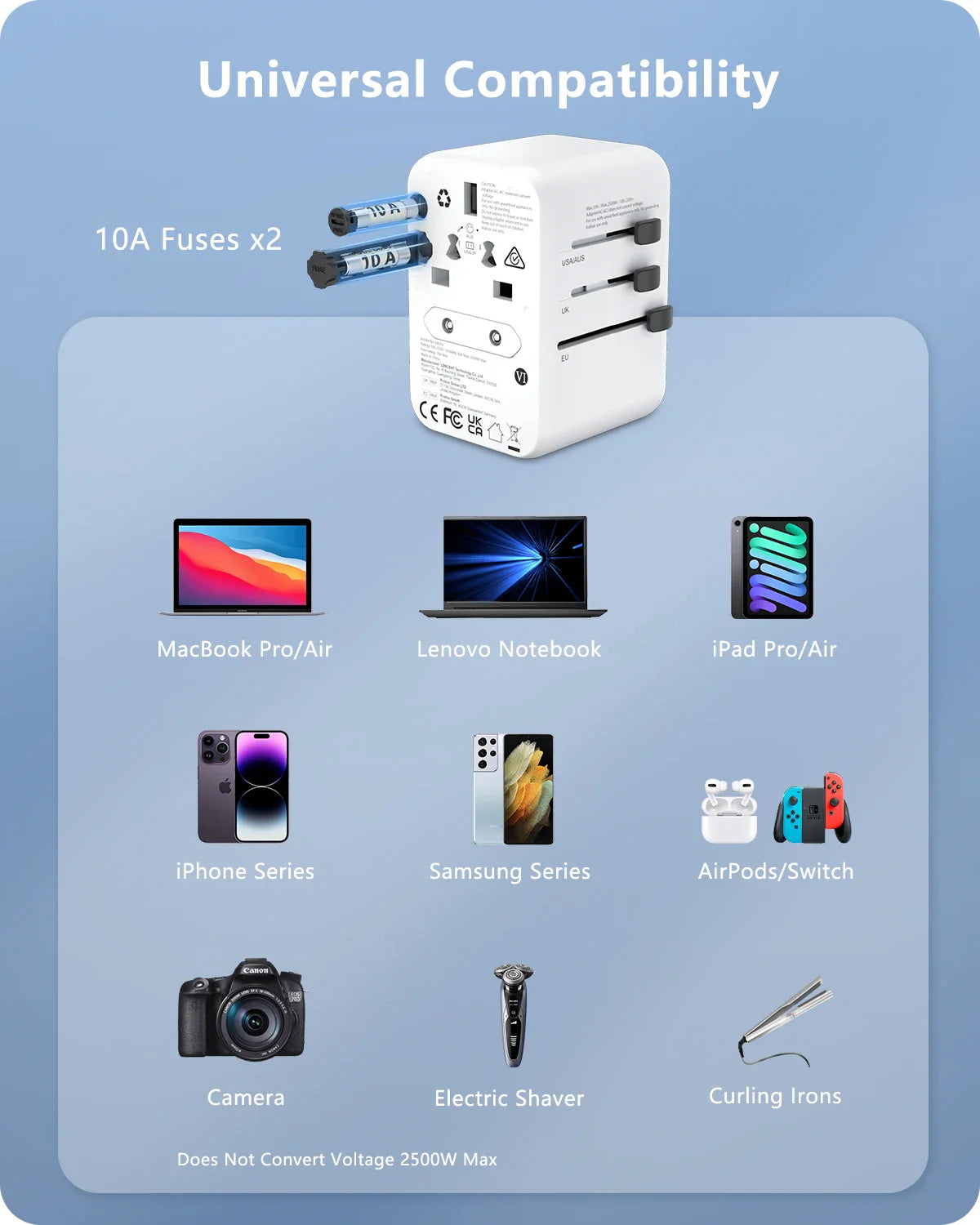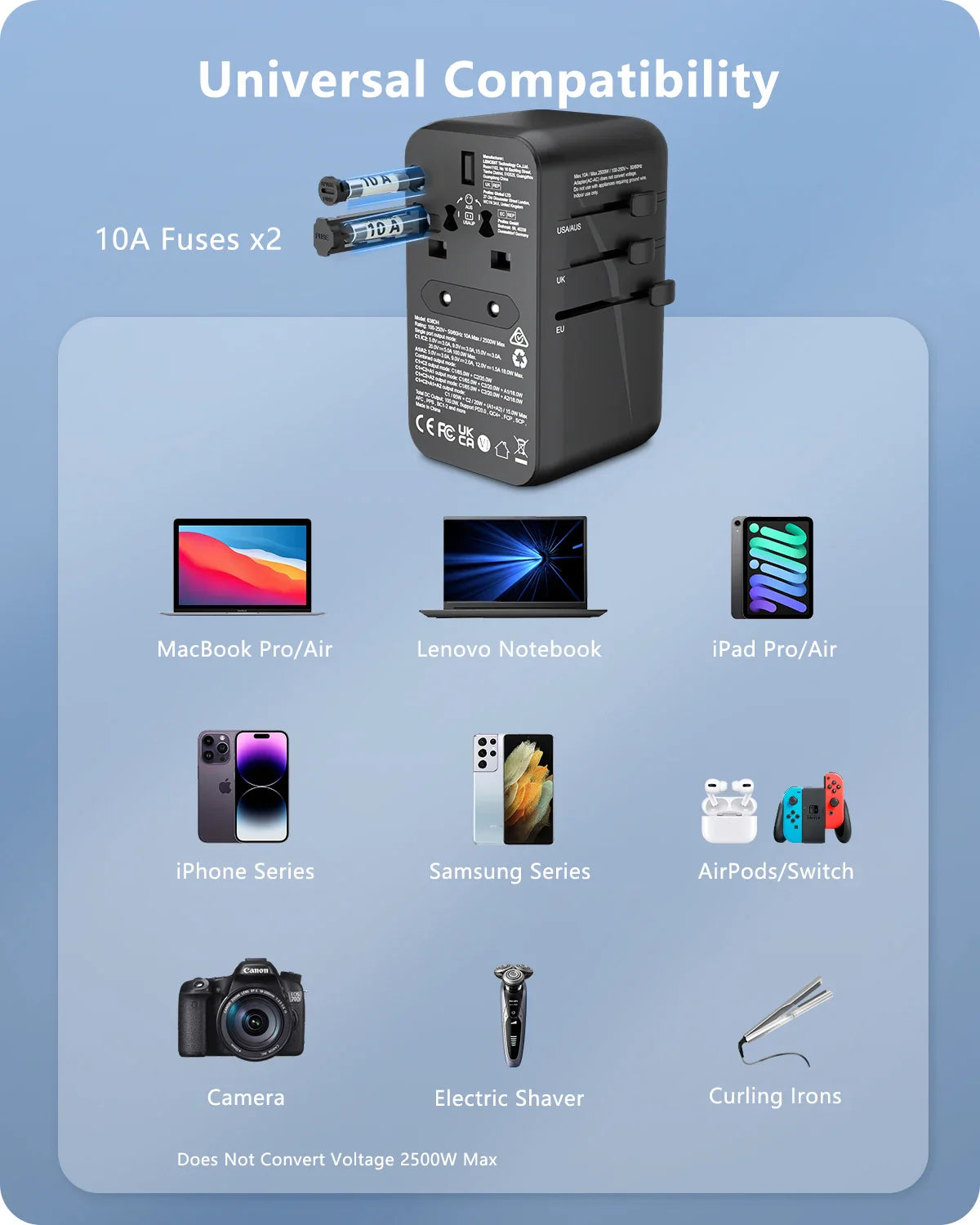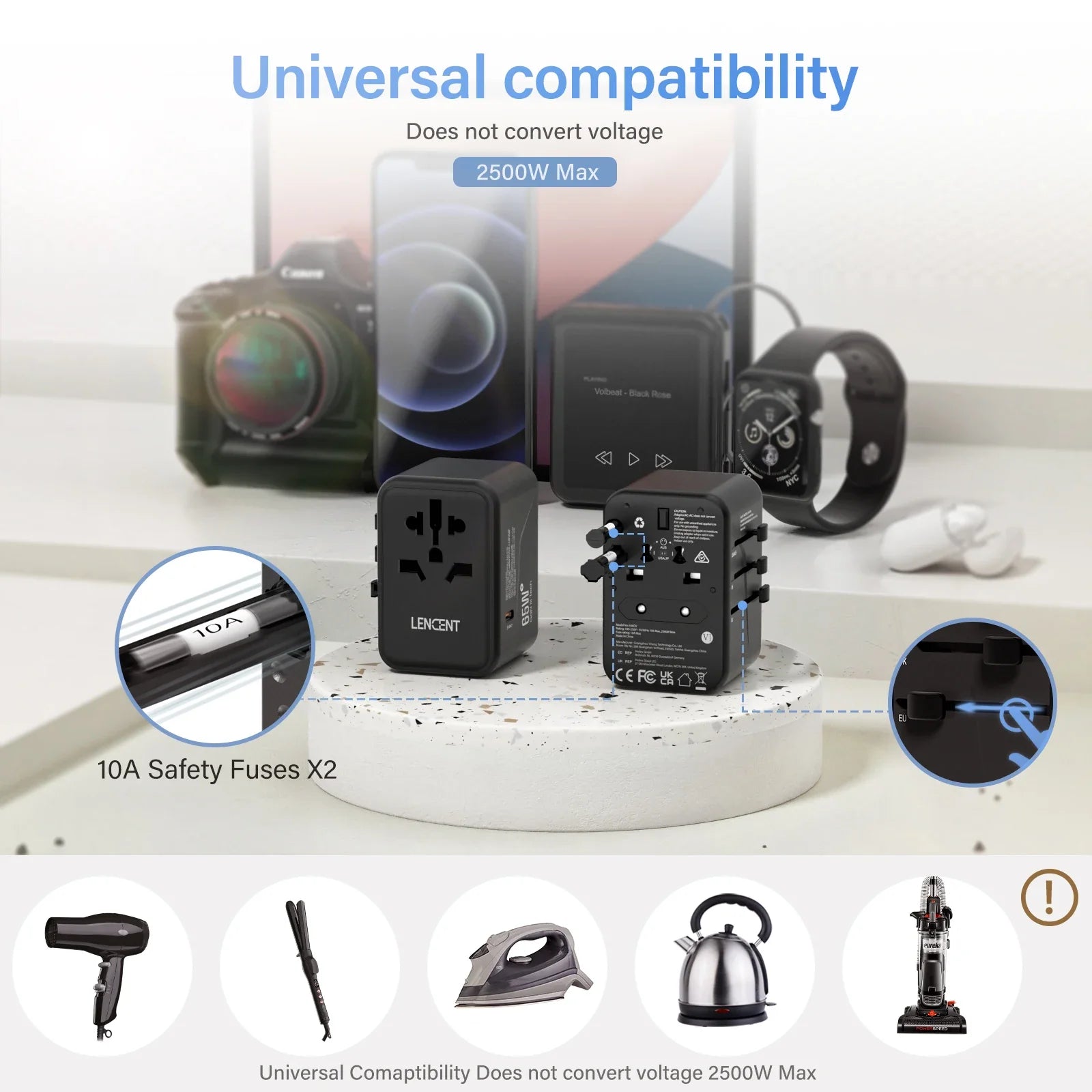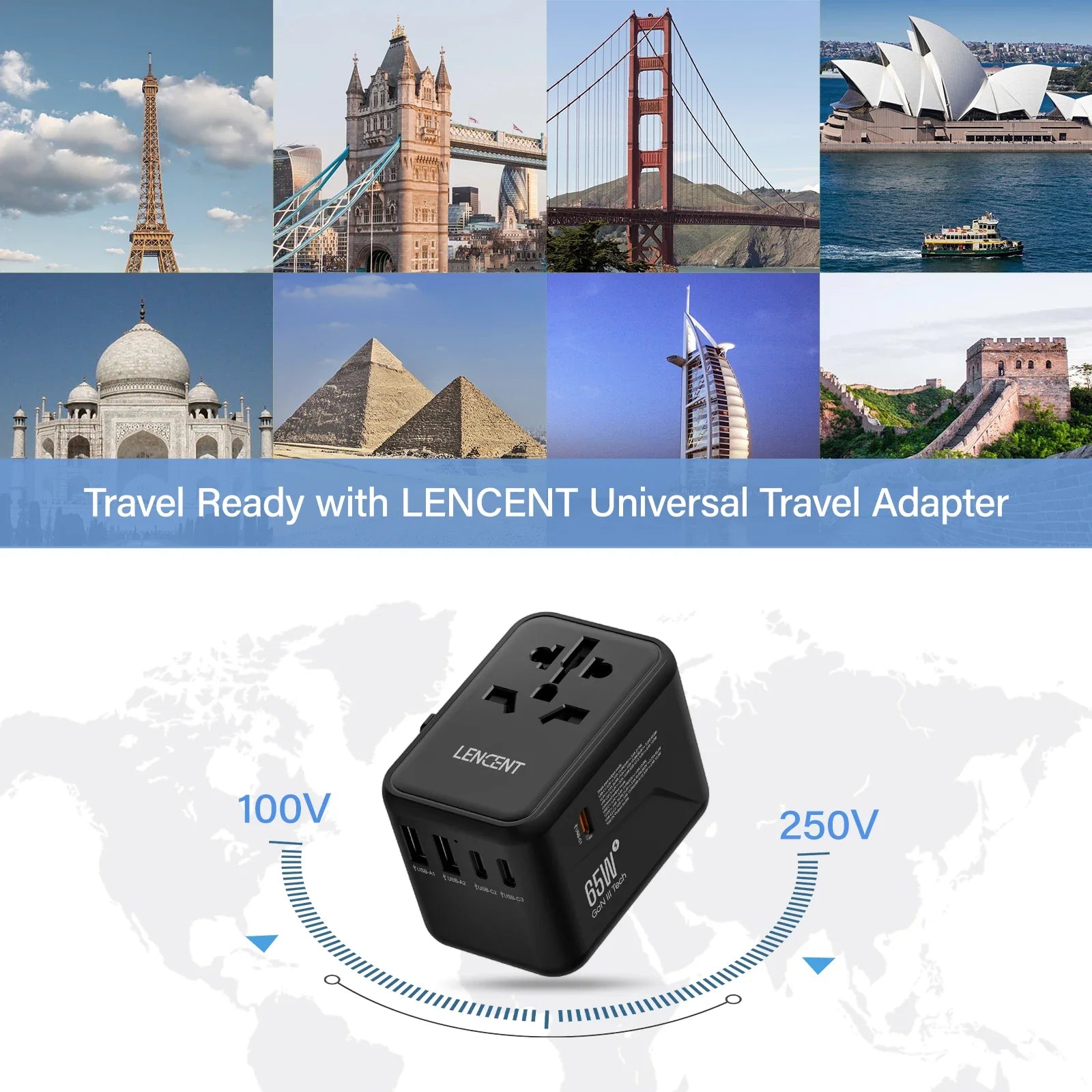 LENCENT 65W/100W GaN International Travel Adapter with 2USB 3 Type C GaN Fast Charging Adapter with EU AU US UK Plug for Travel
