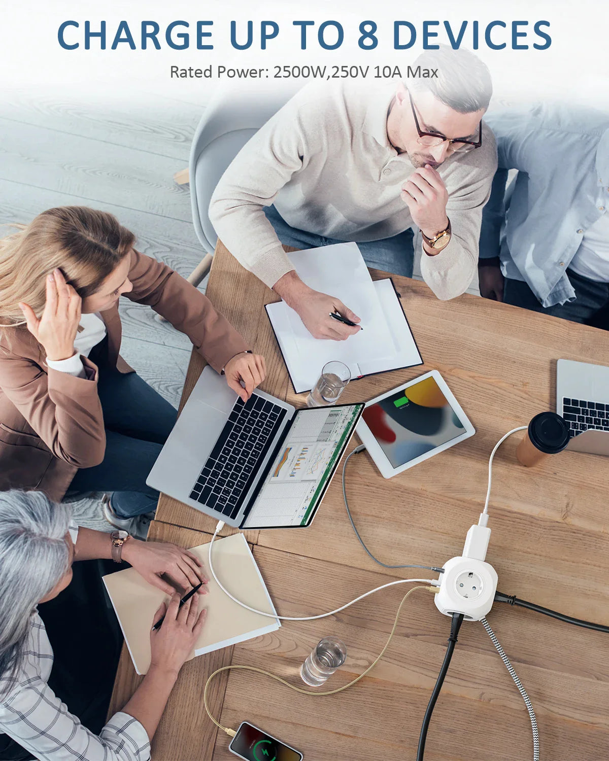 AC plug: Maximum power up to 2500 watts (max. 250 V, 10A). With this power strip, you can use them at home and in the office,ect. USB ports input voltage: 100V - 250V AC, 50/60 Hz, 0.4A. USB output: 5V DC / 3.4A (total) 5V DC / 2.4A (single connection) Type C Ports: 5V/3A. UNIQUE AUTO-ID LENCENT technology automatically identifies all your devices and provides the best charging current for maximum and safe charging.