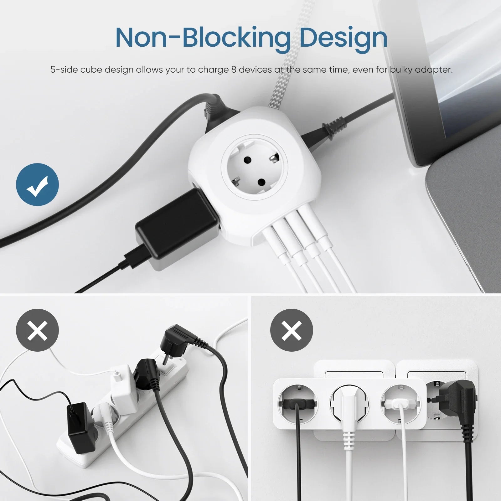 LENCENT Upgraded EU Flat Plug Power Strip Cube with 4 AC Outlets 3 USB Port 1 Type C 2M /3M Braided Cable Multi Socket with Switch for Home