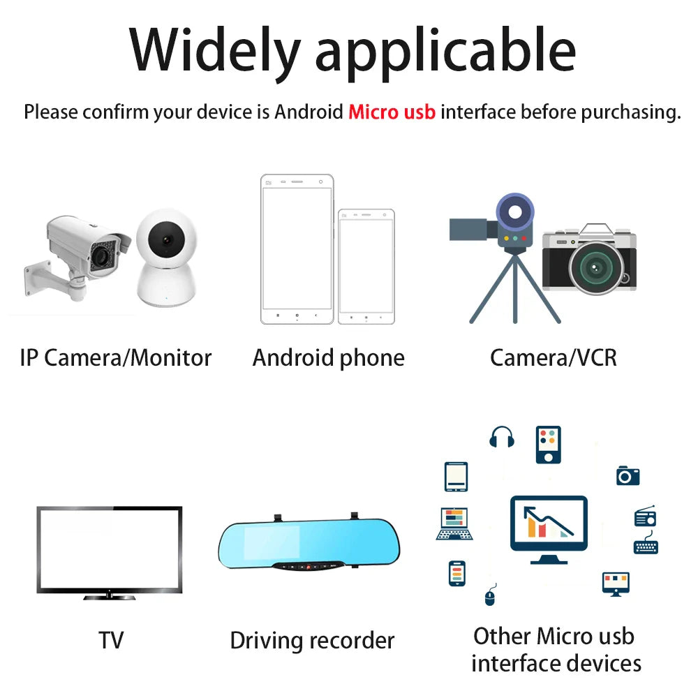 🟢Applicable To: Android Phone,IP camera,Driving recorder,CCTV,Webcam,Monitor,Camera/VCR,Other Micro USB device.etc