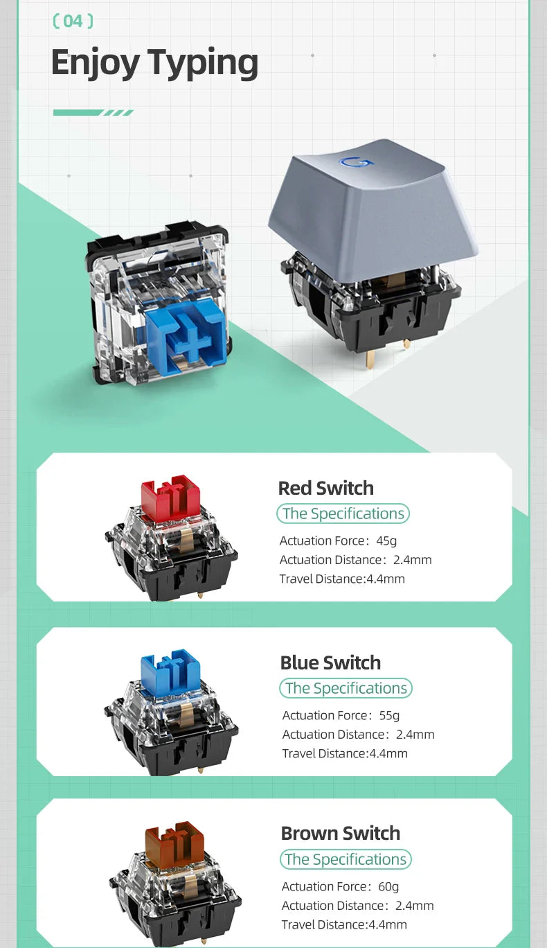 The K500 is designed to fit your dedicated typing experience. No matter what you like, linear, clicky or a little in between, we've got you covered with three Huano switches options (Blue, Brown, Red). We want to make sure that you experience the same feedback for every keystroke.