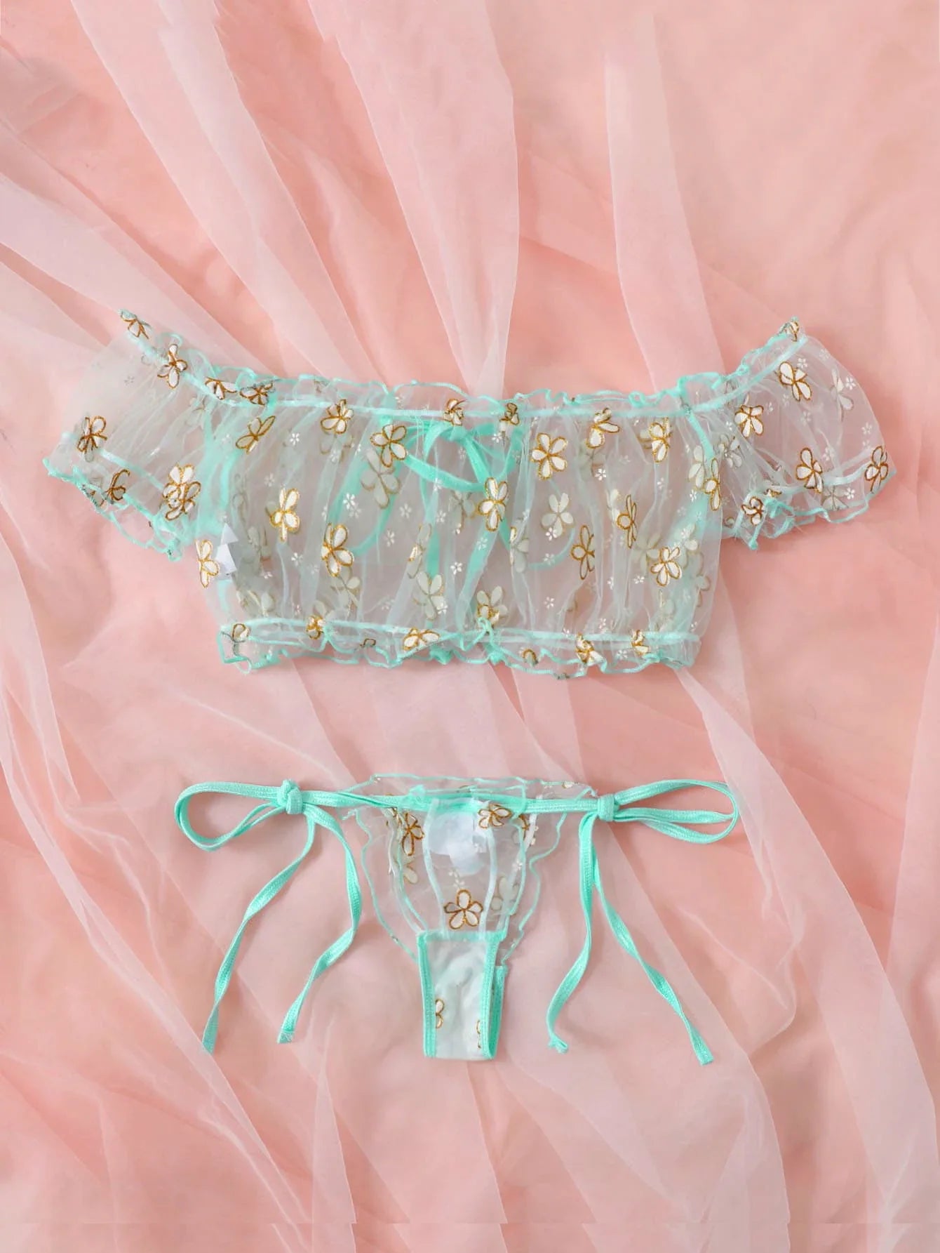 Sexy Fancy Lingerie Set 2 Pieces Transparent Halter Off Shoulder Women's Underwear Beautiful Daisy Print Bra And Panty Sets