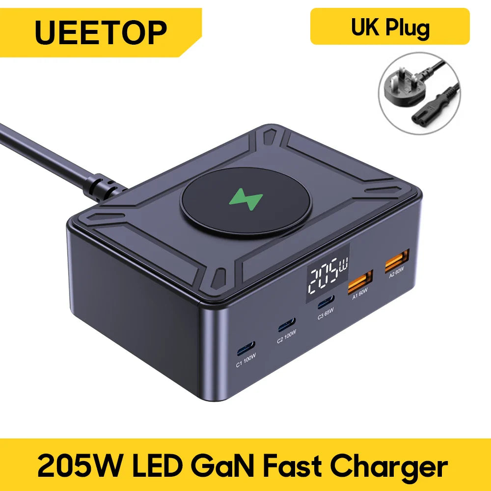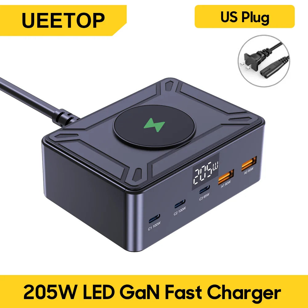 Ueetop 205W GaN Charger Digital Display Desktop USB Type C Charger PD 100W PPS 45W QC4.0 Fast Charging For Laptop Tablet Phone