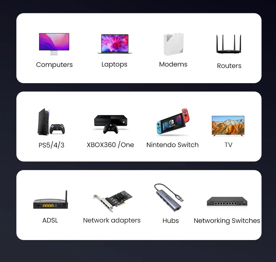 Compared to a wireless network, Ethernet cables provide a wired network for a more secure and reliable Internet connection. Use Ethernet cables to easily connect computers and peripherals to your LAN. Equipped with RJ45 connectors, the Ugreen Cat-6 Ethernet patch cable provides universal connectivity for everything from computers, printers, servers, routers to network media players, network-attached storage devices, VoIP phones, and other standard office equipment.