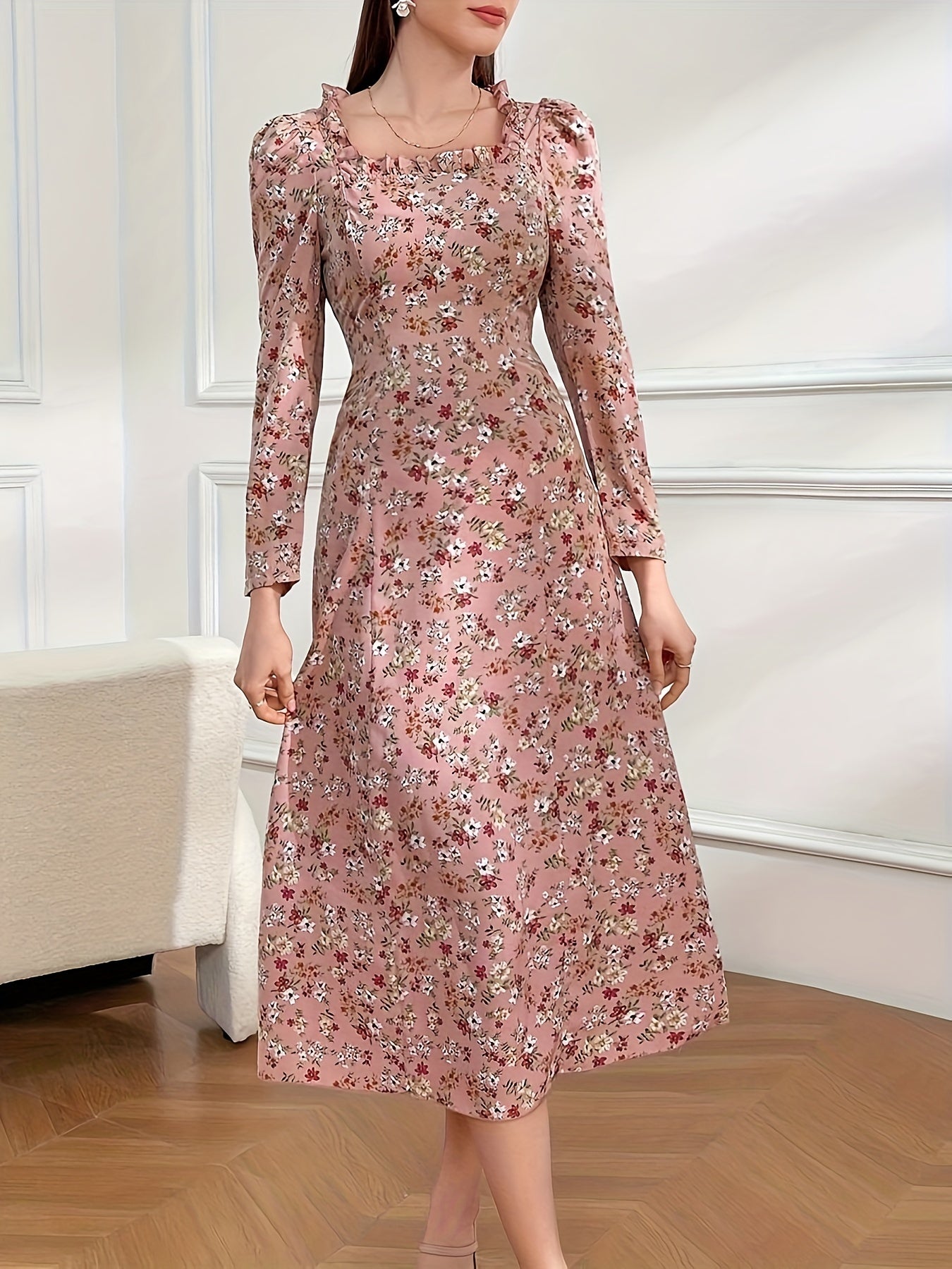 Vibrant Floral Print Square Neck Blouse - Elegant Ruffle Trim, Long Sleeve, Slim Fit, Comfy, Versatile, Spring & Fall Essential - Women's Stylish Clothing for Everyday Wear