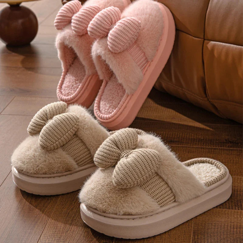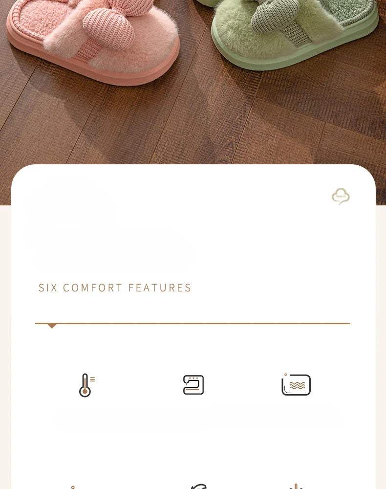 Women Fashion Plush Warm Bows Cotton Slippers Couple Winter New Thick Soft Sole Slides Men Indoor Floor Flat Home Non-slip Shoes